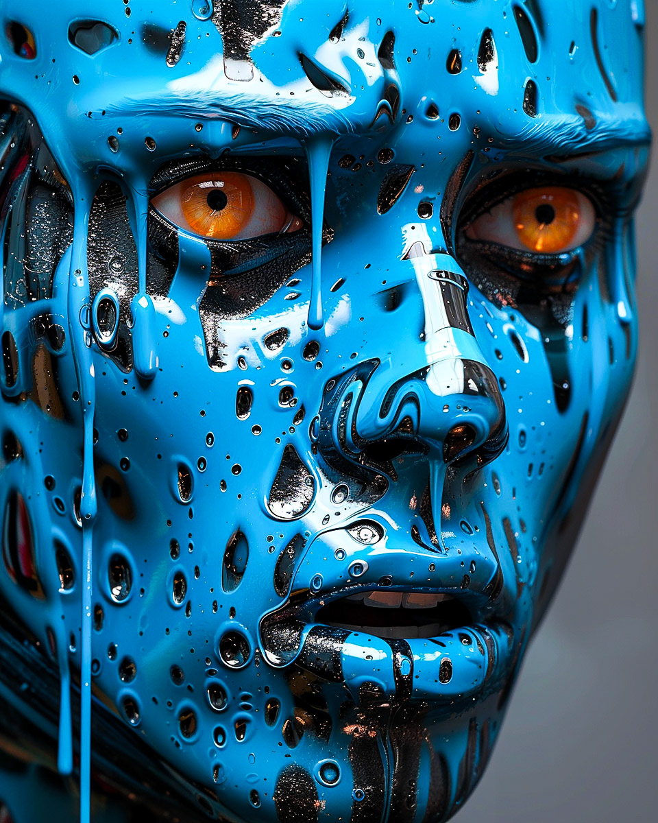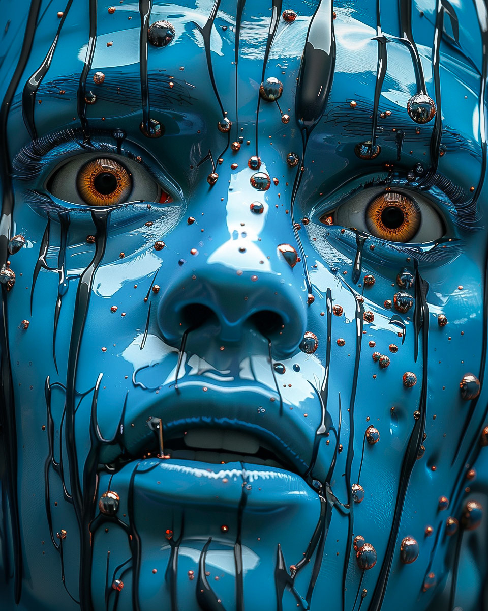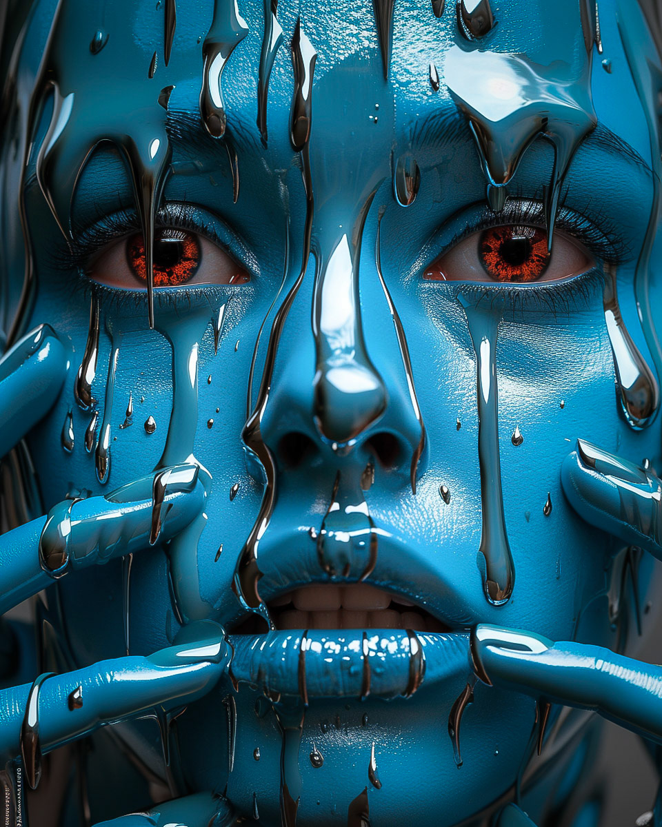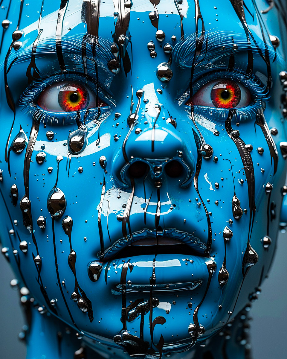 Blue fear cascades, a dance of digital tears and metallic dreams.